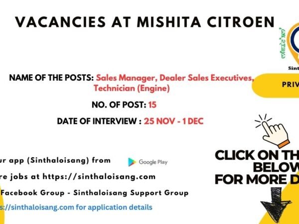 Mishita Citroën, authorised Citroën dealer in Canchipur, Imphal, is looking for dedicated and skilled individuals to join our team. Exciting opportunities available across multiple roles …