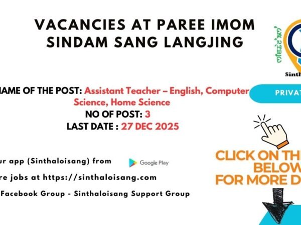 Paree Imom Sindam Sang, Langjing invites applications from qualified and dedicated candidates for the following teaching positions: Vacancy Details Name of the Post: Assistant Teacher …