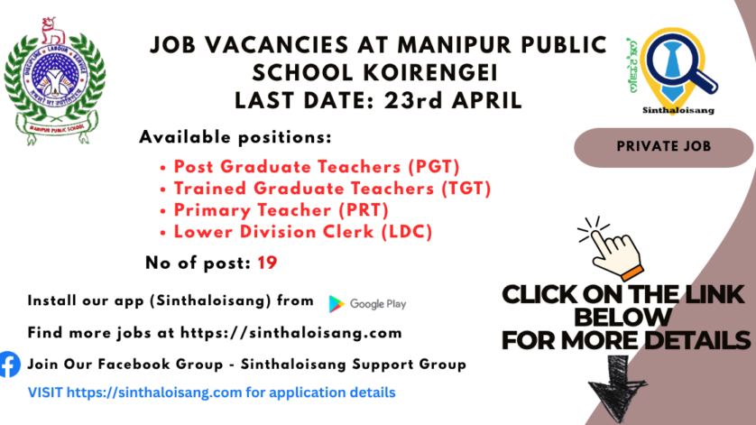 Manipur Public School, Koirengei, Imphal (CBSE Affiliated) invites applications from eligible and interested candidates for various teaching and non-teaching posts on a contractual basis.