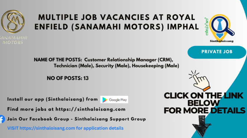 Royal Enfield is inviting applications for multiple positions at its authorized dealership, Sanamahi Motors in Imphal.