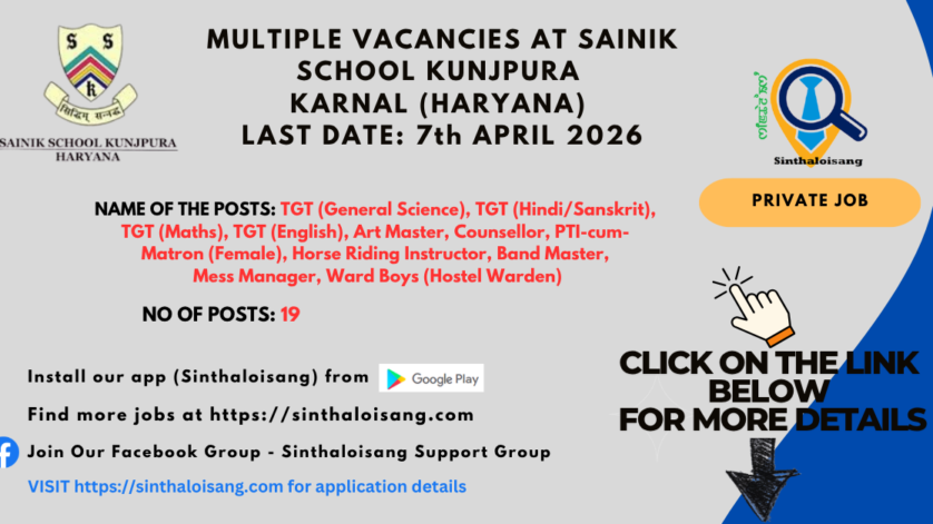 MULTIPLE VACANCIES AT SAINIK SCHOOL KUNJPURA KARNAL (HARYANA)| LAST DATE: 7th APRIL 2026