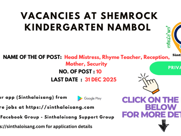 Shemrock Kindergarten, Nambol (Nambol Bazar) invites applications from eligible and dedicated candidates for the following positions: Vacancy Details Name of the Post: Head Mistress (Female) …