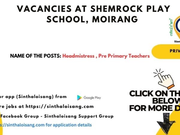 Shemrock play school Moirang invites applications from interested candidates for the following teaching position: Vacancy Details Name of the Post: Headmistress (Pre-Primary) Gender : Female …